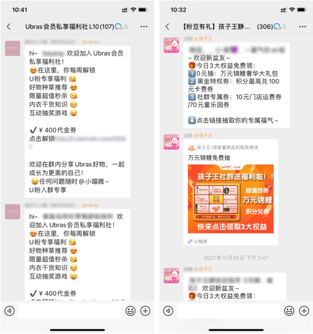 相比在朋友圈進行客戶觸達,社群群發(fā)的觸達方式更加直接,更加實時,且隨時隨地可以觸達客戶。不過,運營社建議,在用社群做客戶觸達時,盡量做到「定時定點」輸出。首先,可以將群服務(wù)以及群規(guī)放入企業(yè)微信的「自動歡迎語」里,告知客戶在社群可以獲得的服務(wù)和社群規(guī)則,幫助客戶更好地了解這個社群是做什么的,出現(xiàn)違反社群規(guī)則的成員,可以順理成章地將其移除群聊。比如 Ubras 、孩子王等的私域社群,會在群歡迎語中寫清楚社群客戶可以享受到的服務(wù),清晰明了,讓客戶對社群產(chǎn)生期待并持續(xù)關(guān)注。
