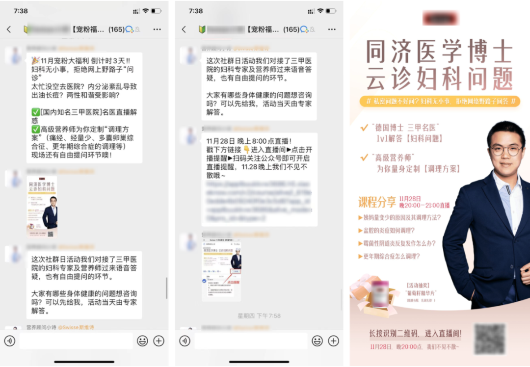 某保健品公司會專門邀請到專業(yè)的大咖,開展免費的健康知識科普直播,給用戶提供一個可以“暴露”出痛點的場景,引導(dǎo)用戶在直播間進行提問。