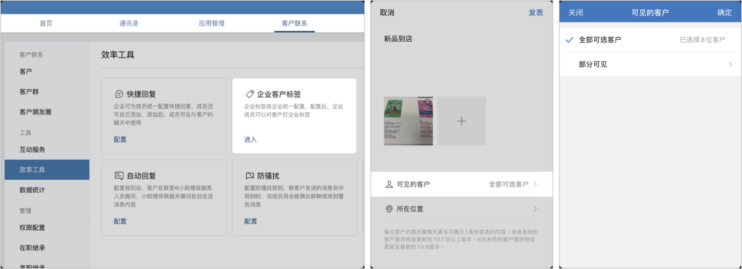 可以說,在「存量用戶經(jīng)營」這方面,微信生態(tài)確實是最優(yōu)解。而溝通體驗和微信一樣,但又是為企業(yè)量身打造的企業(yè)微信,更是變現(xiàn)陣地的「重中之重」。做「滲透式營銷」有個關(guān)鍵,就是想方設(shè)法和用戶產(chǎn)生連接。在企業(yè)微信上,我們可以通過多種方式和用戶產(chǎn)生連接,比如 1Vn 的朋友圈觸達、社群群發(fā)以及 1V1 的私聊。那么企業(yè)微信是如何幫助更好地做「滲透式營銷」的呢?1)朋友圈觸達,支持多種內(nèi)容形式