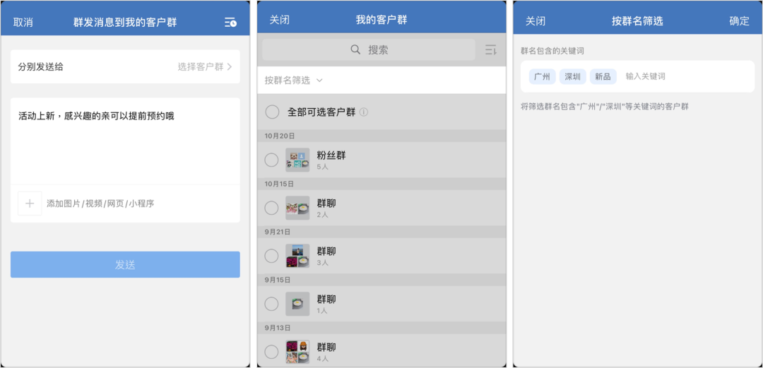 同時,群內(nèi)容的形式可以多樣化一點,除了群內(nèi)文字分享,還可以通過轉(zhuǎn)發(fā)視頻號內(nèi)容、發(fā)起企業(yè)微信直播來對用戶進行觸達。相比文字,這些內(nèi)容的感染力更強、理解門檻更低,很適合作為內(nèi)容輔助,來幫助我們豐富群內(nèi)容。如果是做直播,可以先在企業(yè)微信設(shè)置「預(yù)約直播」,讓群內(nèi)用戶對直播進行預(yù)約,開播后可以自動提醒用戶來看直播:值得一提的是,利用企業(yè)微信可以實現(xiàn)一鍵客戶群群發(fā),運營人員可把通知、祝福、活動等消息批量發(fā)送到不同的客戶群,提升服務(wù)效率,方便管理成百上千的社群。PS. 每個客戶群每天可接收來自成員的 1 條消息、每月還可接收來自企業(yè)的 4 條消息;每次群發(fā)群主都可選擇 200 個客戶群。3)1v1私聊,定制化內(nèi)容提升轉(zhuǎn)化