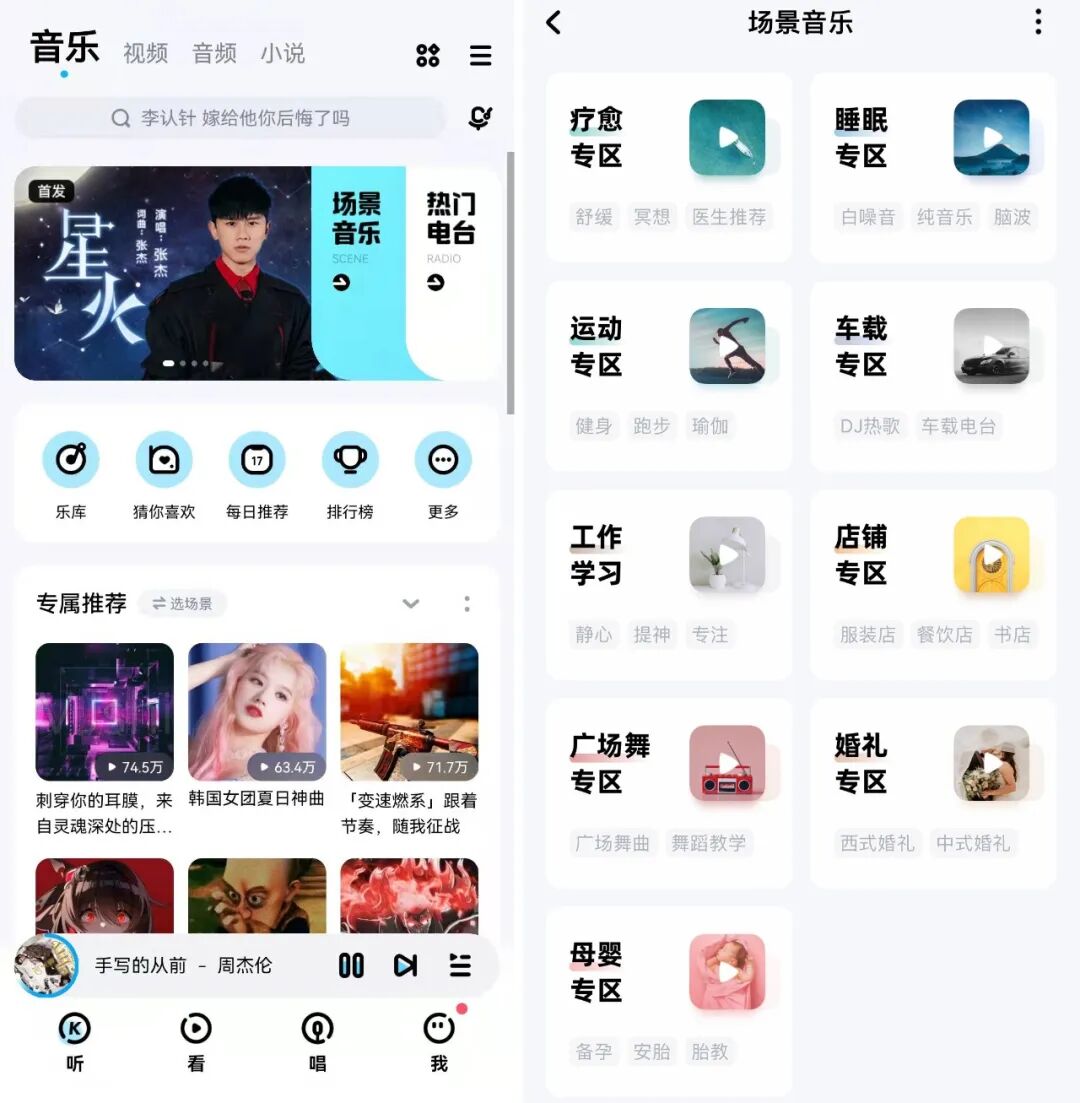 無論是酷狗音樂的產(chǎn)品升級,還是星巴克的“咖快”,深入挖掘一眾品牌升級體驗(yàn)的特點(diǎn),就會(huì)發(fā)現(xiàn)它們不外乎是將消費(fèi)者的感受、情緒融入到設(shè)計(jì)之中,把服務(wù)作為“舞臺”,產(chǎn)品作為“道具”,環(huán)境作為“氛圍”,激發(fā)消費(fèi)者在產(chǎn)品以外的參與感。看似不起眼的小改變,卻能給原本平平無奇的產(chǎn)品和服務(wù)增值。仔細(xì)推敲這些創(chuàng)新本身,它們都有著這些共性,就是:場景化、感官化、個(gè)性化。以酷狗音樂11.0版本的產(chǎn)品升級為例,我們不妨來一一解讀下。先來看看場景化,就是消費(fèi)者使用產(chǎn)品時(shí),所向往的某種場景或者生活方式,這表現(xiàn)在酷狗音樂的“場景音樂”上。過往我們要找到對應(yīng)的場景音樂,只能通過音樂app搜索框,輸入關(guān)鍵詞如“運(yùn)動(dòng)”、“深夜”、“喜慶”等搜索,根據(jù)推薦相關(guān)的歌曲或者歌單找歌,整體體驗(yàn)比較碎片化和被動(dòng)。現(xiàn)如今,用戶打開酷狗音樂11.0版本,就能在首頁頂部找到“場景音樂”的內(nèi)容板塊,直接點(diǎn)擊跳到對應(yīng)的場景音樂專區(qū),對比之下大大簡化了搜索和體驗(yàn)流程。此外,酷狗還洞察不同用戶的場景需求,對消費(fèi)者情緒進(jìn)行挖掘和細(xì)分,設(shè)計(jì)運(yùn)動(dòng)、療愈、工作等情景。具象化的跑步、解壓場景打造,可以讓用戶在更加匹配的場景中,自我烘托氛圍,獲得超強(qiáng)的超強(qiáng)的音樂代入感,聽歌時(shí)得以更好地釋放情緒。