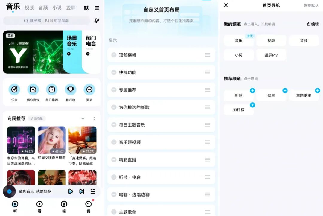最后的個(gè)性化不難理解,就是為消費(fèi)者打造更精準(zhǔn)的個(gè)性化定制品,從而提供千人千面的定制生活體驗(yàn)。就像酷狗音樂的自由式布局,給予用戶一次當(dāng)自己產(chǎn)品設(shè)計(jì)師的機(jī)會(huì),可以根據(jù)實(shí)際的功能需要,靈活編輯增減頻道模塊,定制更符合自身交互習(xí)慣的酷狗首頁界面。