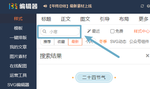 本次上新的小寒樣式,一共24個。包含正文、標題、引導(dǎo)關(guān)注、圖片、二維碼等多種樣式,在135編輯器內(nèi),搜索關(guān)鍵詞:小寒,即可使用。