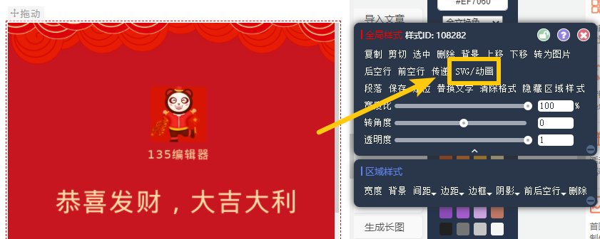 135編輯器在每個(gè)SVG樣式都設(shè)置了一個(gè)『SVG/動(dòng)畫』按鈕,胖友們可以在『SVG/動(dòng)畫』設(shè)置中利用『編輯樣式原圖』對SVG樣式進(jìn)行修改。