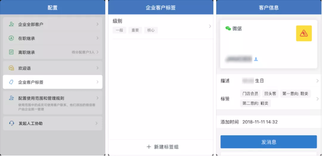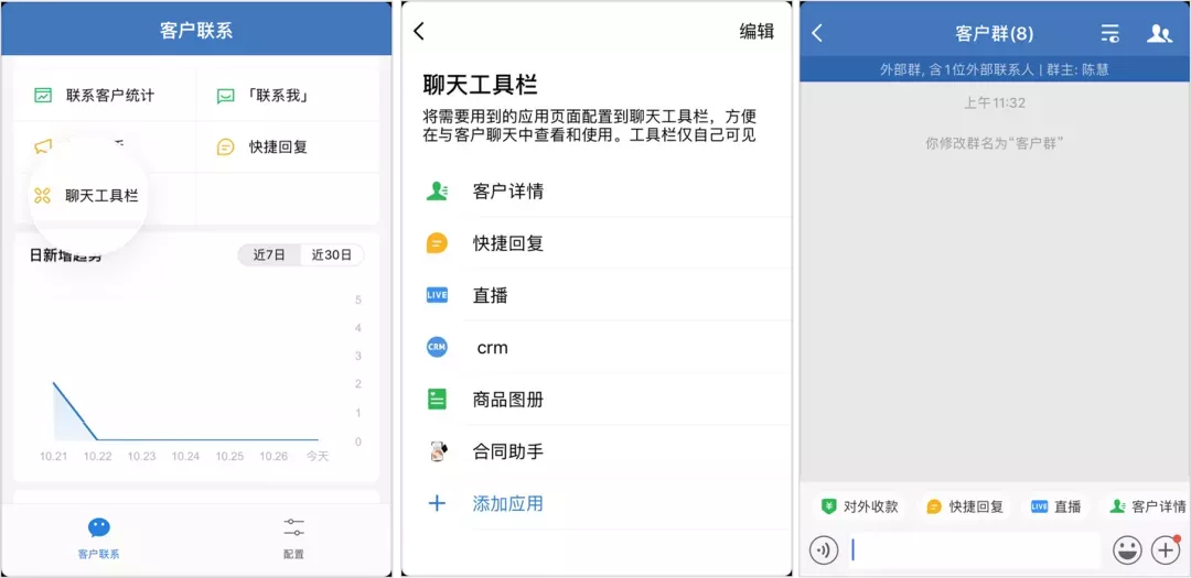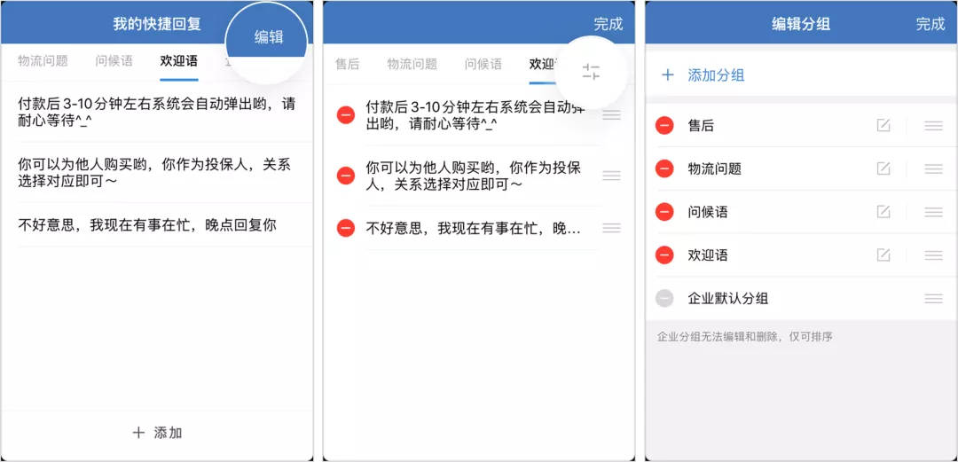 鐘薛高的 1v1 轉(zhuǎn)化很簡單,沒有強運營,只是在添加好友自動回復(fù)里添加優(yōu)惠券,引導(dǎo)新用戶領(lǐng)取,以期實現(xiàn)引流即轉(zhuǎn)化。另外,在群主的個人主頁中,也有轉(zhuǎn)化入口“官方商城”,方便直接轉(zhuǎn)化用戶。不過,對鐘薛高這類客單價并不是特別高的產(chǎn)品來說,在 1V1 私聊轉(zhuǎn)化上不需要投入過多精力,而是想辦法在用戶的每個“觸點”(個人主頁、添加自動回復(fù)等)加上轉(zhuǎn)化鏈接,讓用戶可以“隨手下單”。除此之外,運營人員在和客戶私聊轉(zhuǎn)化的過程中,可以總結(jié)一些客戶常見問題的答案,統(tǒng)一放到快捷回復(fù)中,按照不同類型的問題進(jìn)行編輯分組,比如問候語、歡迎語、物流問題、產(chǎn)品介紹、售后服務(wù)等,大大提升溝通效率。 除了通過快捷回復(fù)提升私聊的服務(wù)效率之外,企業(yè)微信還有個強大的功能有著異曲同工之妙——聊天工具欄。運營人員可以對聊天工具欄已有的工具進(jìn)行調(diào)整,調(diào)整順序或刪除,將常用的工具比如客戶詳情、快捷回復(fù)、商品圖冊等功能放在前面,當(dāng)和客戶溝通的時候,方便直接調(diào)用。 在私聊的時候,運營人員還是要按照「內(nèi)容節(jié)奏」來,可以使用企業(yè)微信的「標(biāo)簽群發(fā)」,對不同時期加進(jìn)來的客戶做個性化觸達(dá),保證效果最大化。 2)社群轉(zhuǎn)化