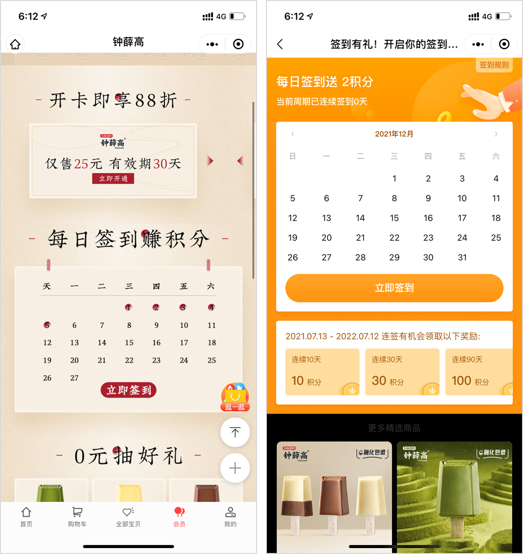 鐘薛高做私域留存的第三大陣地是小程序。靈活應(yīng)用小程序,在小程序打造會員體系,群主會引導(dǎo)用戶去小程序簽到、參與活動等獲取積分。