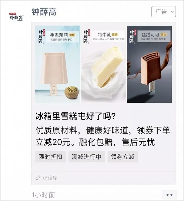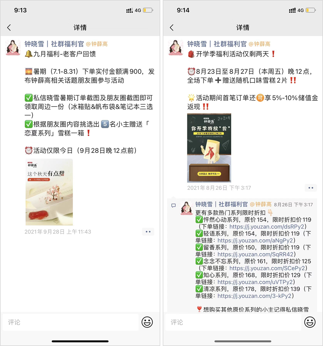 鐘薛高的朋友圈轉(zhuǎn)化,主要是 3 類內(nèi)容:場景化內(nèi)容、節(jié)日活動信息、秒殺活動信息。第 1 類,場景化內(nèi)容。主要就是在朋友圈給用戶“創(chuàng)造”一個使用產(chǎn)品的場景,讓用戶身臨其境,感同身受:在這秋冬颯爽的天氣來一片……,在午后的搖椅上慢慢品嘗,享受一下休息的快樂……場景化表達(dá)突出產(chǎn)品特色,像“小電影”一樣把產(chǎn)品特色植入在用戶的腦子里,在無形中給用戶種了草,進(jìn)而引導(dǎo)下單。第 2 類就是節(jié)日活動信息。鐘薛高不放過每一個節(jié)日和關(guān)鍵的營銷節(jié)點,他們會特別為了做活動,找到一些為做品牌促銷打折的理由,比如九月福利-老客戶回饋、開學(xué)季福利活動等。借著節(jié)日和營銷節(jié)點的熱度,找到正當(dāng)理由給用戶發(fā)券,可以提升轉(zhuǎn)化效率。第 3 類就是秒殺活動信息,社群活動和朋友圈活動同步進(jìn)行,觸達(dá)到更多的用戶參與活動。秒殺活動就是簡單粗暴,不失為一種高效提升轉(zhuǎn)化的活動玩法。04