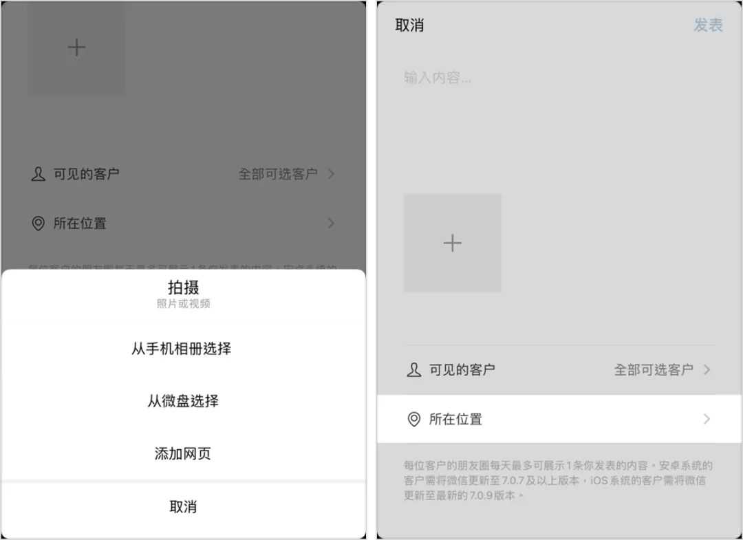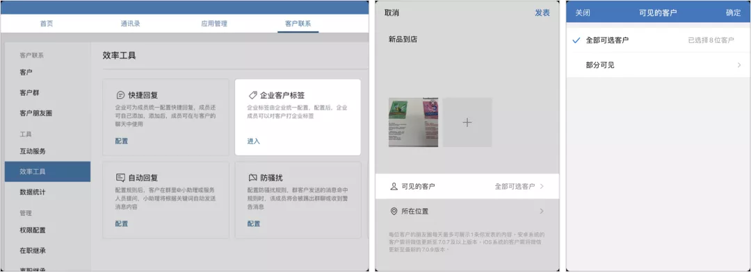 當(dāng)社群量級很大的時候,企業(yè)微信的「群發(fā)」功能就顯得至關(guān)重要了。「群發(fā)」功能支持每個社群每天可以收到 1 條來自員工發(fā)布的消息,每個月還可以收到 4 條企業(yè)發(fā)送的消息。群主編輯好要群發(fā)的內(nèi)容,選擇要分發(fā)的社群就可以實現(xiàn)一鍵分發(fā)了,每次群發(fā)群主都可選擇 200 個社群,還可以群名的關(guān)鍵詞進(jìn)行篩選,迅速定位到目標(biāo)社群。 這個功能大大提升了消息分發(fā)的效率,尤其是對于用戶量級較大的公司來說,節(jié)省了大量的人力。2)朋友圈精細(xì)化運營,提升用戶信任度