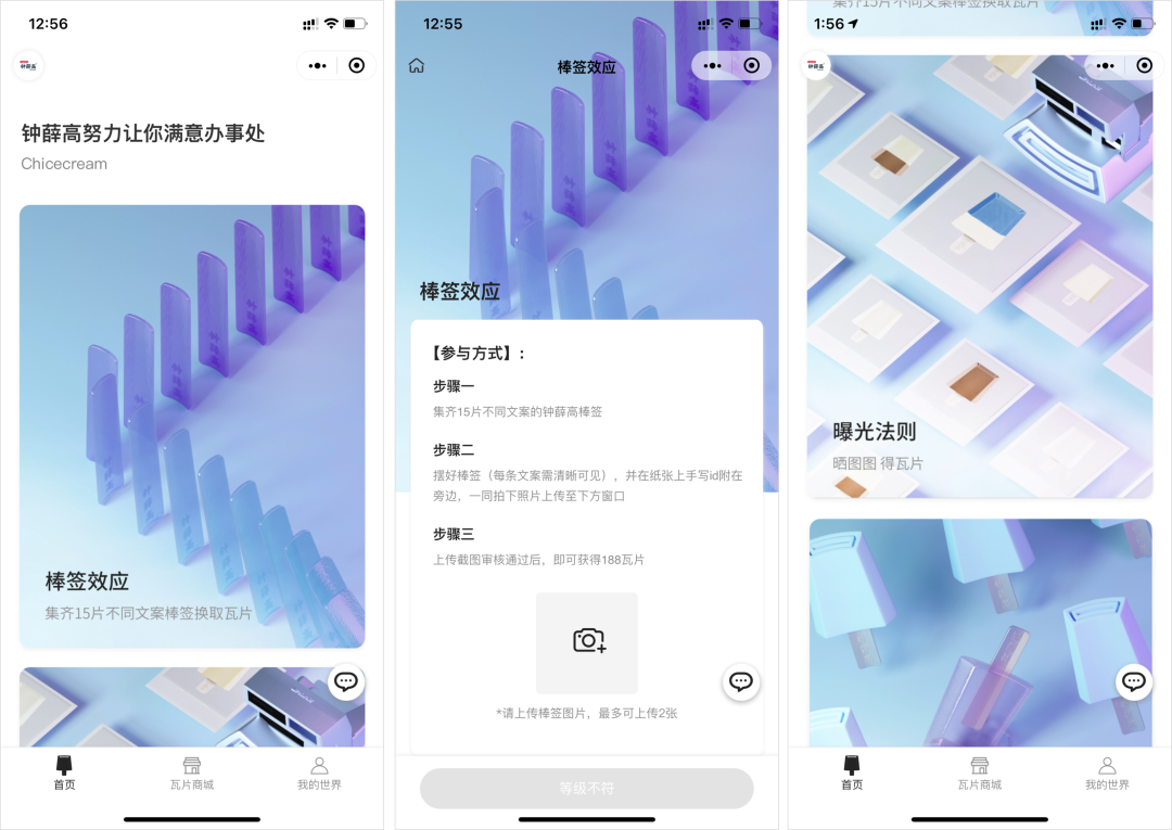 每日簽到領(lǐng)取積分用戶獲得的積分可以兌換抽獎機(jī)會,可以抽到優(yōu)惠券、積分等,當(dāng)然也可以直接兌換產(chǎn)品周邊,積分的兌換機(jī)制充分調(diào)動了用戶參與熱情。值得一提的是,鐘薛高還有個專門的“鐘薛高努力讓你滿意辦事處”小程序,小程序里的“棒簽效應(yīng)”活動,引導(dǎo)用戶收集不同文案的鐘薛高雪糕棒簽,拍照發(fā)布在小程序上。這種玩法可以說是非常妙了,一方面用戶會為了收集更多“棒簽文案”下更多的單;另一方面,用戶上傳的“棒簽”相關(guān)內(nèi)容,也是一種使用者見證,在無形中提升用戶忠誠度,甚至可以讓圍觀用戶種草并下單。在這里,不得不說企業(yè)微信的社群,私聊,朋友圈都是支持小程序的,企業(yè)可以在企業(yè)微信上,充分利用小程序?qū)崿F(xiàn)“簽到喚醒→活動激勵→下單轉(zhuǎn)化→私域回流”的閉環(huán)。03