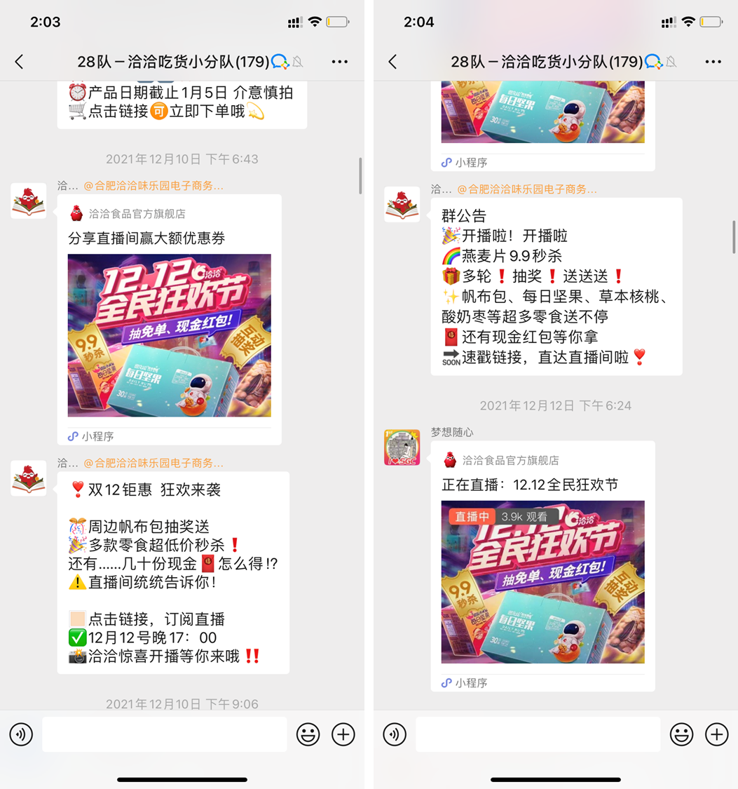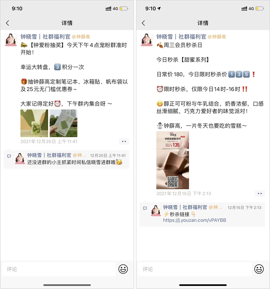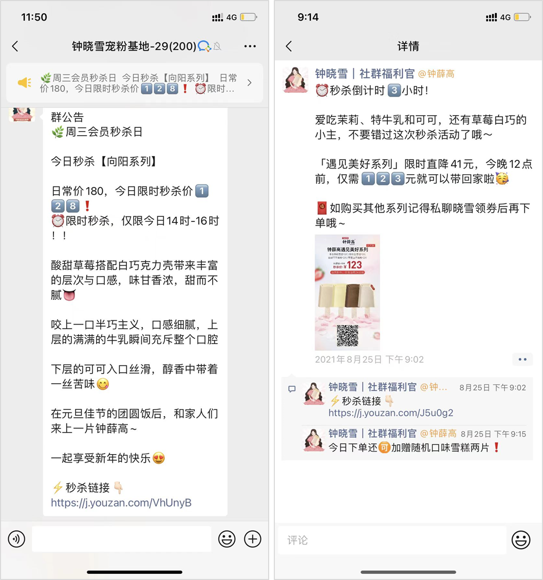 鐘薛高主要是通過秒殺、團(tuán)購活動等來提升社群轉(zhuǎn)化。每周三社群秒殺活動,給用戶養(yǎng)成習(xí)慣,在固定的時間蹲點秒殺活動。還有的品牌會在社群定時做一些直播,在直播間做秒殺、抽獎、發(fā)布大額優(yōu)惠券等活動,提升用戶的參與熱情,營造一種濃厚的營銷氛圍,讓用戶“無腦”下單。如果是做直播,可以先在企業(yè)微信設(shè)置「預(yù)約直播」,讓群內(nèi)用戶對直播進(jìn)行預(yù)約,開播后可以自動提醒用戶來看直播:3)朋友圈轉(zhuǎn)化