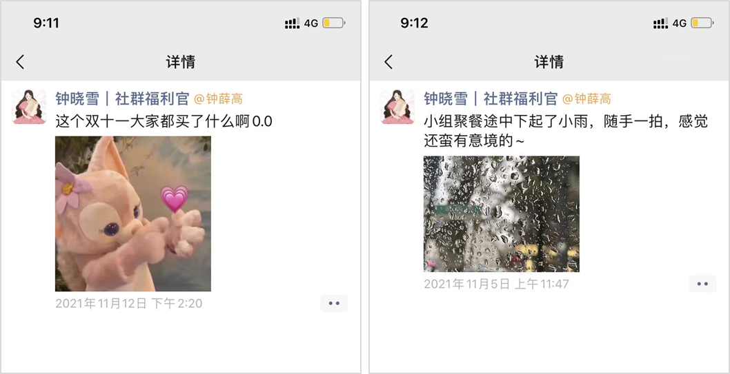除了發(fā)布活動信息之外,生活化的內(nèi)容是做朋友圈培育的必選項。群主通過朋友圈分享日常,拉近和用戶的距離,讓用戶感覺可以和群主(IP)像朋友一樣相處,而非冷冰冰的買賣關(guān)系。這類內(nèi)容可以是嘗試和用戶對話:這個雙十一,大家都買了什么?。灰部梢允呛陀脩舴窒泶蚬と粘?,讓用戶感覺這個賬號背后是一個有血有肉有溫度的人,如此一來,可以提升用戶對于群主(品牌)的信任度。③ 征集用戶反饋,給用戶“種草”