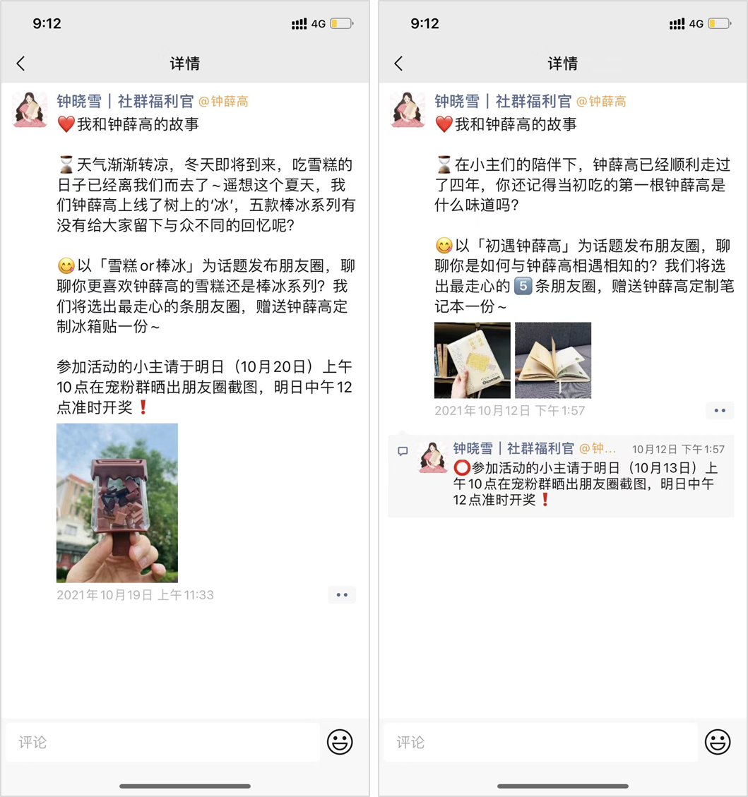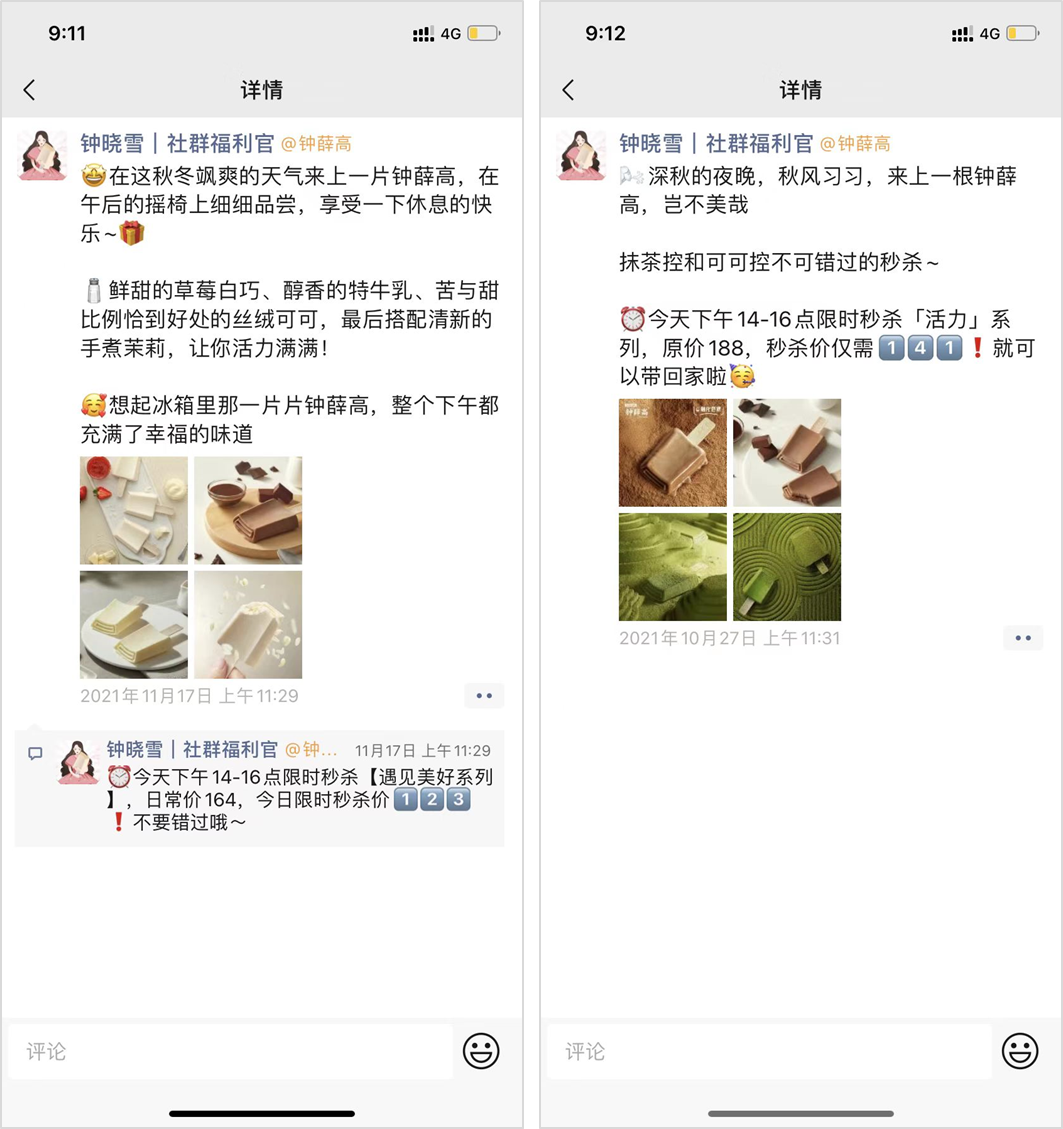 活動開始前幾個小時,鐘薛高會分時間段在朋友圈同步活動信息、產(chǎn)品動態(tài)等內(nèi)容,引導(dǎo)用戶評論互動、關(guān)注。② 生活化內(nèi)容,拉近和用戶距離