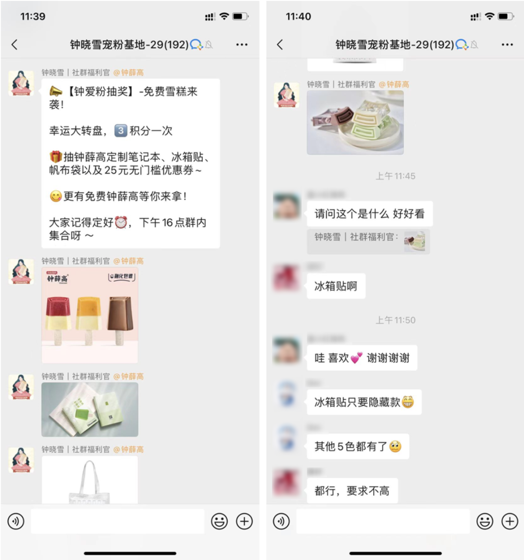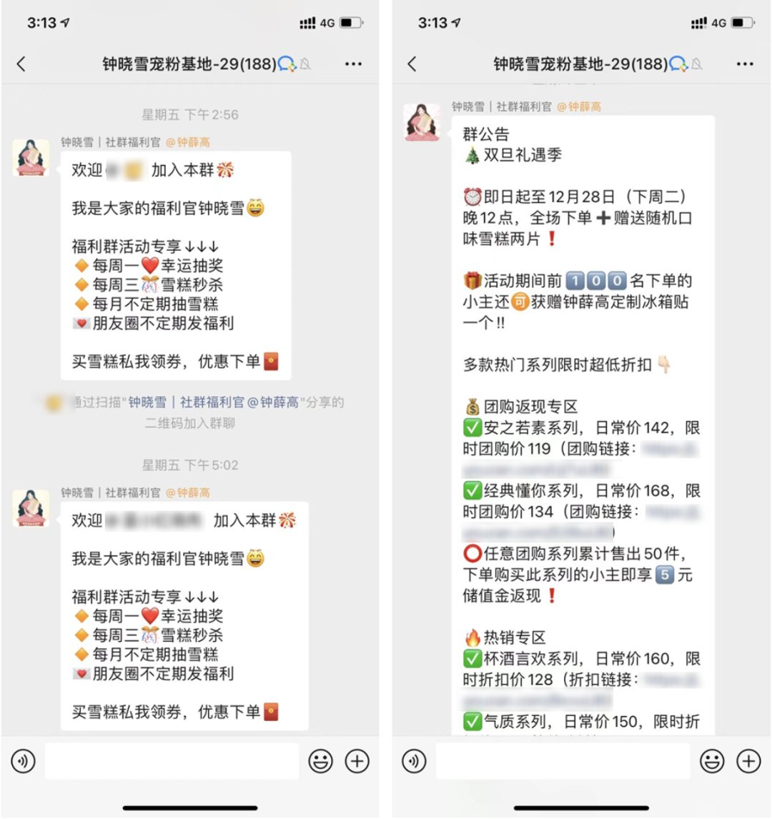 鐘薛高做私域留存的第一大陣地就是社群,在社群內(nèi)定期發(fā)起活動,重點通過社群的核心節(jié)點——群主(鐘曉雪|社群福利官),引導(dǎo)用戶參與活動。比如鐘薛高會在入群歡迎語中,告知用戶社群會有哪些活動,比如周一的抽獎活動,周三的秒殺活動,以及不定期的抽雪糕的活動等,這些活動安排會給到用戶預(yù)期,固定時間的固定活動,會在潛移默化中影響用戶的心智,讓用戶想著來參加。