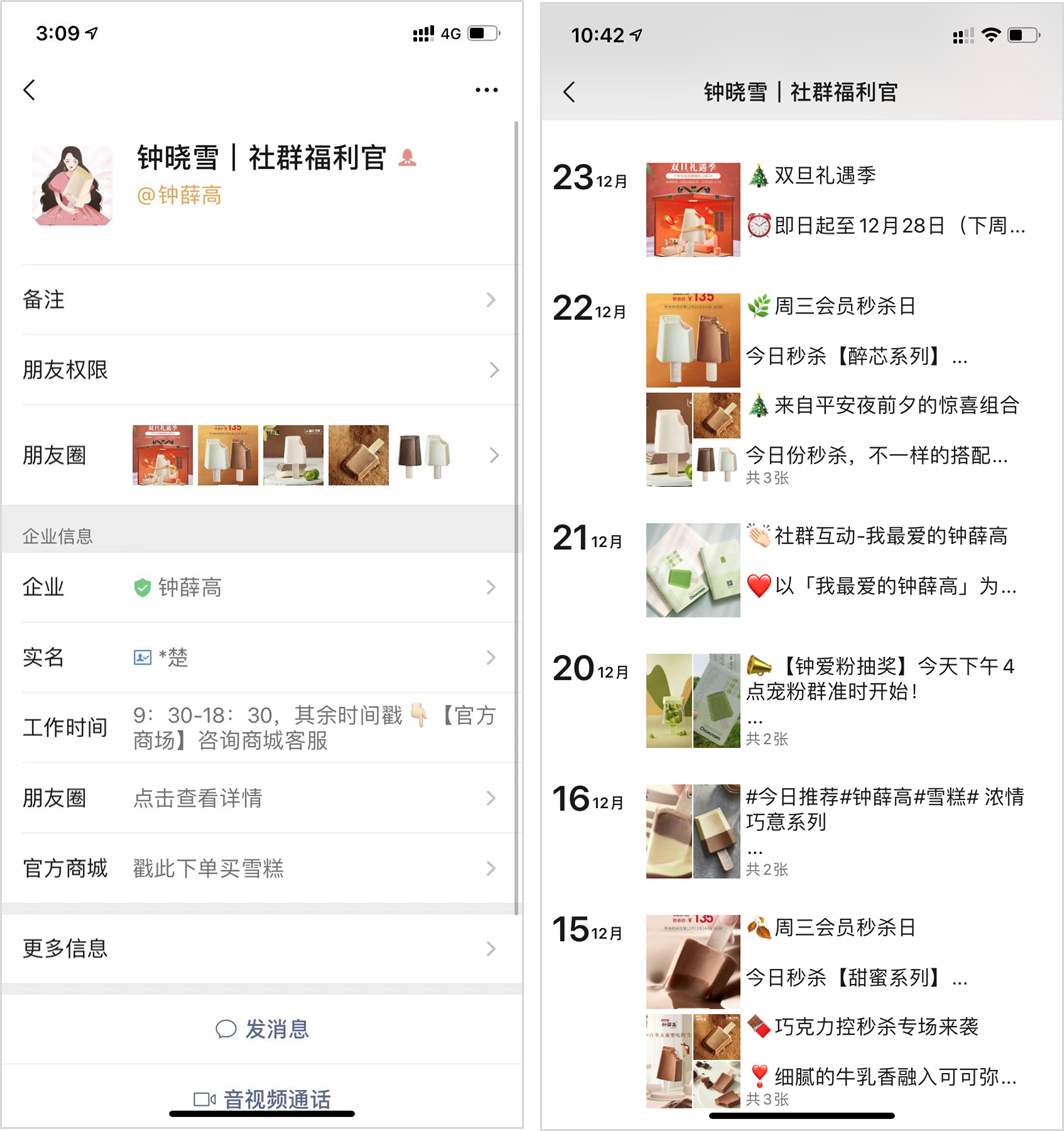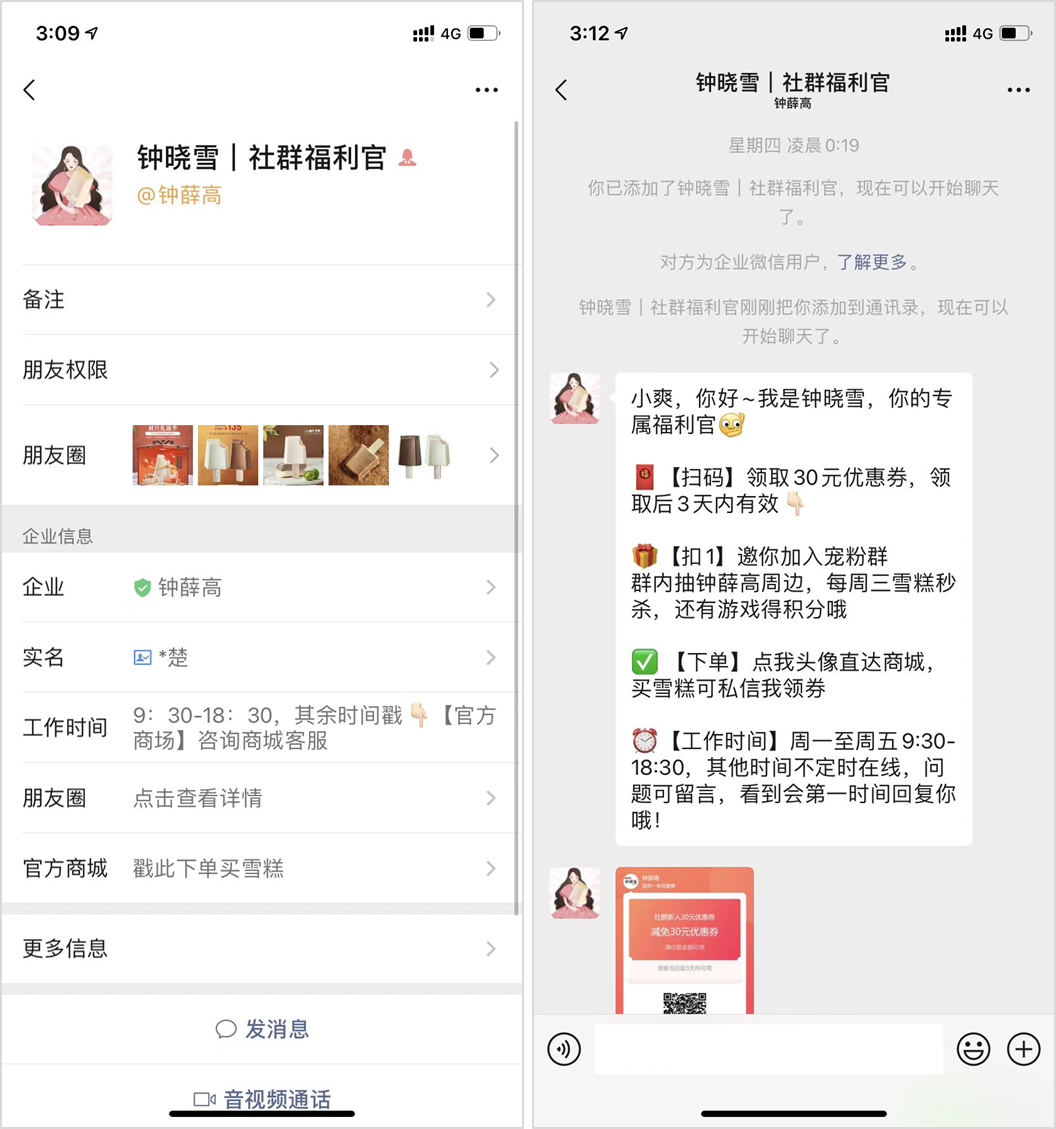 其次是線上渠道之朋友圈廣告投放。做為引流私域的「微信廣告」中的其中一種,朋友圈廣告投放在找準(zhǔn)目標(biāo)用戶群的前提下,是比較高效的引流方式,其優(yōu)勢在于「公域到私域,鏈路最短」。不過「朋友圈廣告」比較適合預(yù)算充足的品牌,在關(guān)鍵營銷節(jié)點“沖業(yè)績”。鐘薛高在朋友圈廣告投放的內(nèi)容上呈現(xiàn)出差異化:每年 3~4 月,配合新品傳播,根據(jù)地域、人群進(jìn)行投放,讓更多的精準(zhǔn)用戶了解新品。值得一提的是,朋友圈廣告投放支持一鍵關(guān)注公眾號和放置企微二維碼,如此一來用戶流失率也降至最低。企業(yè)服務(wù)人員的企業(yè)微信二維碼,可以通過「聯(lián)系我」功能生成,它是添加客戶最高效的方式,使用「聯(lián)系我」二維碼,用戶添加時無需經(jīng)過確認(rèn)自動成為好友。更厲害的是,多人「聯(lián)系我」二維碼可配置多名成員,客戶掃碼可隨機(jī)聯(lián)系其中一位成員,大大提升了用戶的添加效率,以及成員的服務(wù)效率。