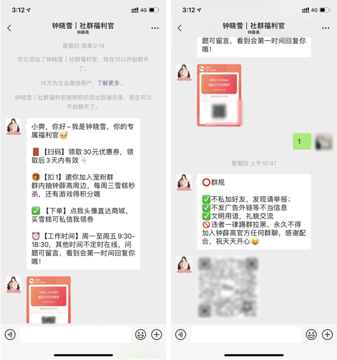 當(dāng)用戶添加運營人員(@鐘曉雪)的企業(yè)微信后,會在企業(yè)微信的自動回復(fù)中,引導(dǎo)用戶參與互動,完成用戶添加后的首次激活。互動行為包括領(lǐng)取優(yōu)惠券下單,扣 1 加入粉絲群,私信領(lǐng)取優(yōu)惠券下單,同時在引導(dǎo)用戶互動的話術(shù)中突出入群利益點,告知用戶加入社群有什么福利,比如優(yōu)惠券、秒殺活動、游戲積分等。