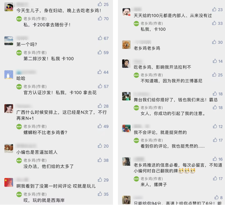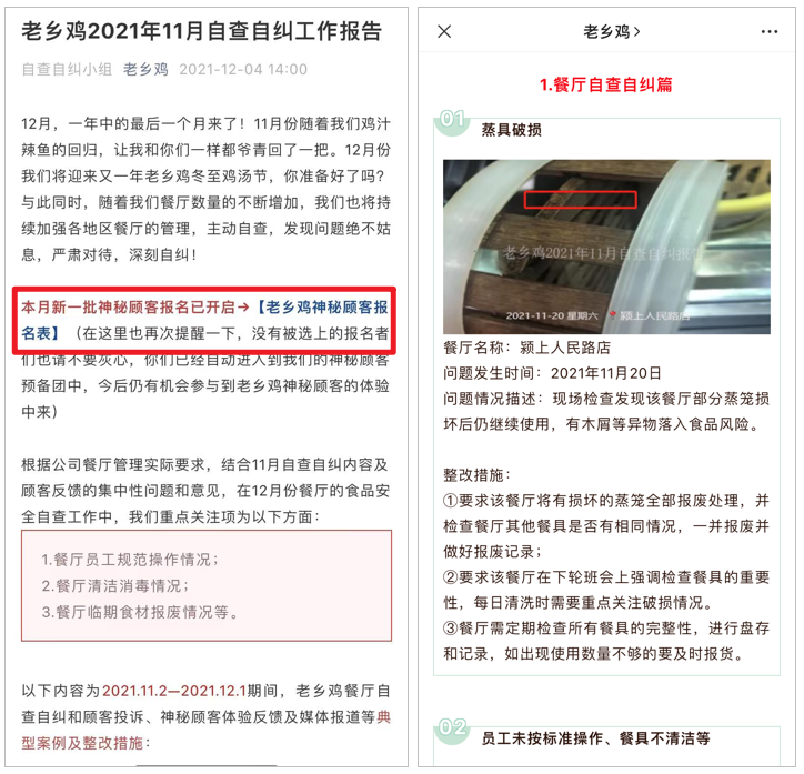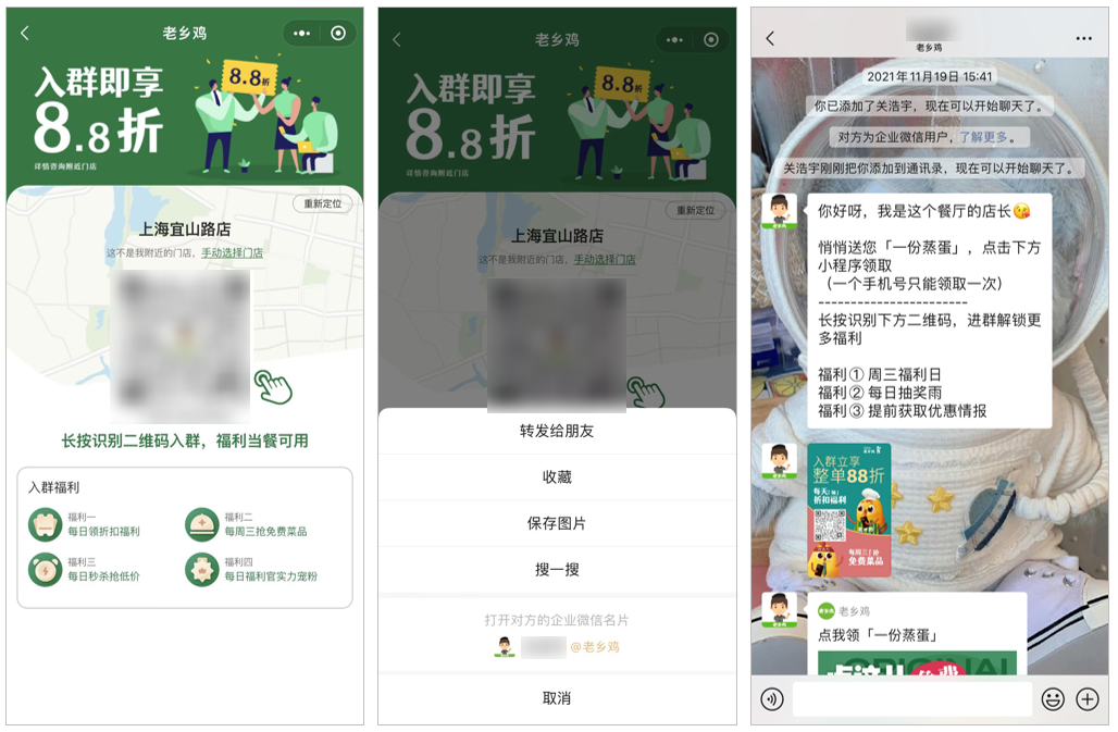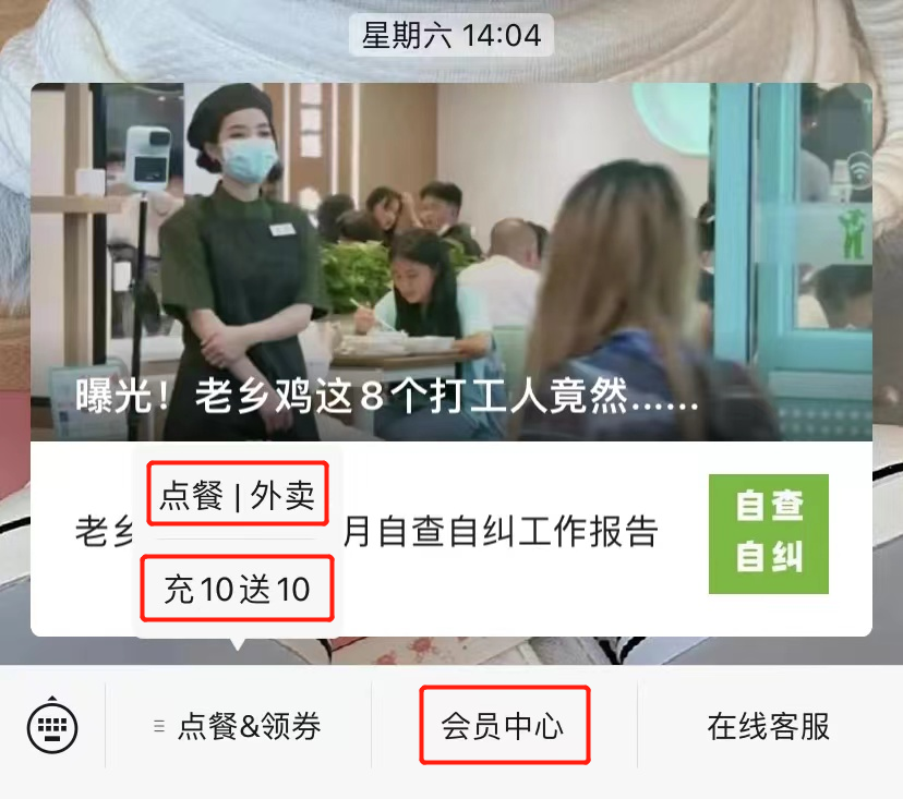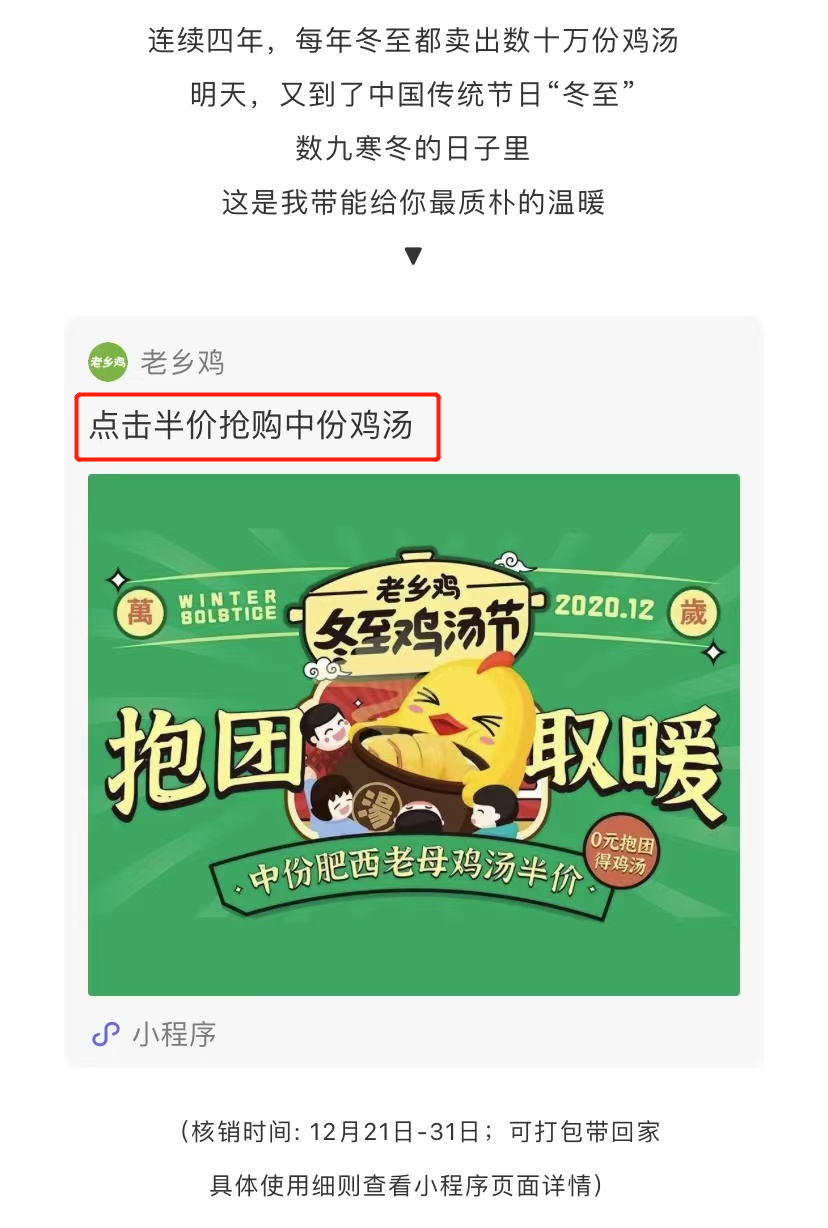 “在網(wǎng)上火了之后,有很多人認識了老鄉(xiāng)雞,會來主動搜索公眾號,吸引了不少前來吃瓜的路人粉?!庇幸晃恢槿耸肯蜻\營社透露,“目前老鄉(xiāng)雞公眾號一天新增的粉絲有幾千人,總粉絲量有大幾百萬?!?/span>在老鄉(xiāng)雞公眾號的菜單欄里,接入了多個通往小程序的入口。比如,用戶點擊“點餐/外賣”,會跳轉(zhuǎn)至小程序的點餐頁面;點擊“充 10 送 10 ”,會跳轉(zhuǎn)至小程序的錢包頁面;點擊“會員中心”,則會跳轉(zhuǎn)至小程序主頁。老鄉(xiāng)雞還會推出一些節(jié)日活動,例如冬至雞湯節(jié)等等。通過在公眾號文章里內(nèi)嵌小程序,再用“半價搶購中份雞湯”這樣的福利關(guān)鍵詞來吸引用戶點擊。用戶進入小程序后,在首頁會看到“入群即享 8.8 折”的優(yōu)惠提示。給出這個提示,是將小程序流量沉淀至企業(yè)微信的關(guān)鍵動作。用戶點擊進入后,系統(tǒng)會自動匹配到離用戶最近的一家門店,提示用戶掃碼。掃描二維碼后,用戶需要先添加門店店長的企業(yè)微信。企業(yè)微信自動通過好友請求后,會給用戶發(fā)送一張帶有社群二維碼的海報。通過掃碼,用戶最終進入了該門店的社群。在添加了老門店店長的企業(yè)微信后,運營社發(fā)現(xiàn)了一個“特別之處”:很多品牌做私域時會選擇在朋友圈定時定量發(fā)推廣內(nèi)容,但老鄉(xiāng)雞門店店長的企微幾乎不更新朋友圈,整個朋友圈里總共就可見三條內(nèi)容。老鄉(xiāng)雞這么做,或許是出于“減少對用戶打擾”的考慮。如果用戶老是看到 TA 不感興趣的朋友圈內(nèi)容,反而容易會把工作人員的企微刪掉。那么不依靠朋友圈,老鄉(xiāng)雞是怎么做用戶留存的呢?運營社發(fā)現(xiàn),老鄉(xiāng)雞在公眾號和服務號上下了很多功夫。老鄉(xiāng)雞的公眾號是服務號,雖然一個月只能推送 4 次,但是相比訂閱號有一個明顯的優(yōu)勢:服務號推送的消息不會被折疊,能夠直接顯示在用戶的聊天列表里,因此曝光率和打開率更高。并且,推送消息越多,不代表效果就越好。如果用戶總是頻繁地接收到來自商家的營銷消息,反而容易取關(guān)公眾號?!坝杏谩辈攀欠仗杻?nèi)容的核心。老鄉(xiāng)雞在做服務號內(nèi)容時就把握了兩個要點:第一,給服務號小編樹立“寵粉”、“接地氣”的人設(shè)。老鄉(xiāng)雞服務號小編常常以“我今天為大家準備了xxx”的第一人稱,來教粉絲怎么領(lǐng)取福利、薅羊毛。并且,服務號小編會對許多用戶的留言進行回復,和讀者互拋段子。說話不打官腔、風趣幽默、還喜歡和粉絲互動,這樣的“人設(shè)”能讓老鄉(xiāng)雞迅速拉近和用戶的距離。用戶感受到屏幕對面是一個活生生的人,而不只是個沒有感情的“推送機器”。從其他公域平臺吸引了很多路人粉后,老鄉(xiāng)雞再通過這樣的互動把他們留下。第二,服務號里有一個特色欄目是“每月自查自糾”。老鄉(xiāng)雞每個月會主動召集一批顧客去檢查餐廳的衛(wèi)生、產(chǎn)品和服務,并且在推文中報備顧客反饋的餐廳管理問題、相應的整改措施以及整改過后的現(xiàn)狀。?????????????????
