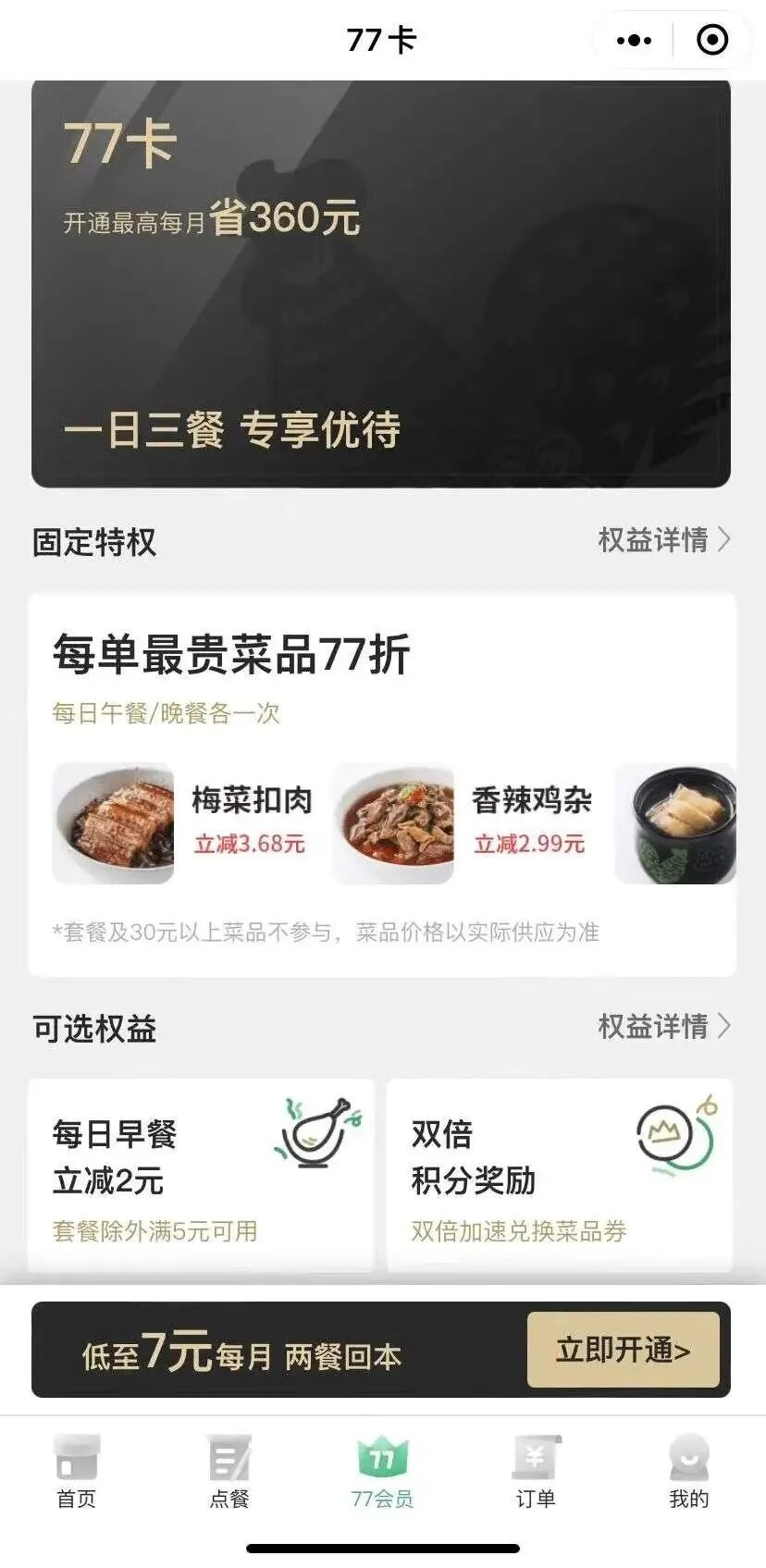在 2020 年底,老鄉(xiāng)雞推出了“ 77 會員卡”——沿用了外賣會員制度,每個月充值 7 元,就可以享受每單最貴菜品 7.7 折、每日早餐減 2 元、雙倍積分等權(quán)益。在當時推廣“ 77 會員卡”時,除了在線上小程序頁面推送、線下門店宣傳之外,老鄉(xiāng)雞還采用了贈送“ 77 嘗鮮卡”這一方式:讓用戶免費體驗 30 天,提前感受到“ 77 會員卡”所帶來的實惠,以此來促使用戶購買會員卡。老鄉(xiāng)雞“ 77 會員卡”鎖定的目標人群就是一個月固定來消費 3-4 次的顧客。知情人士告訴運營社,截至目前,會員卡已經(jīng)賣出了 200 多萬張,復購率提升了 1 倍還要多。對于像老鄉(xiāng)雞這樣客單價較低的產(chǎn)品,想要提升轉(zhuǎn)化率和復購率,相比大額充值,消費門檻更低的優(yōu)惠券和會員卡是一個更好的策略。中式快餐在私域運營上普遍比較滯后,大部分餐飲店在讓顧客掃碼點餐、關(guān)注公眾號之后就沒有太多的運營動作了,老鄉(xiāng)雞算是行業(yè)里起步較早的品牌。在早期,老鄉(xiāng)雞是這樣搭建自己的私域的:2013 年做公眾號;再到 2017 年做小程序,在小程序里可以直接手機點餐;
