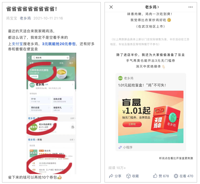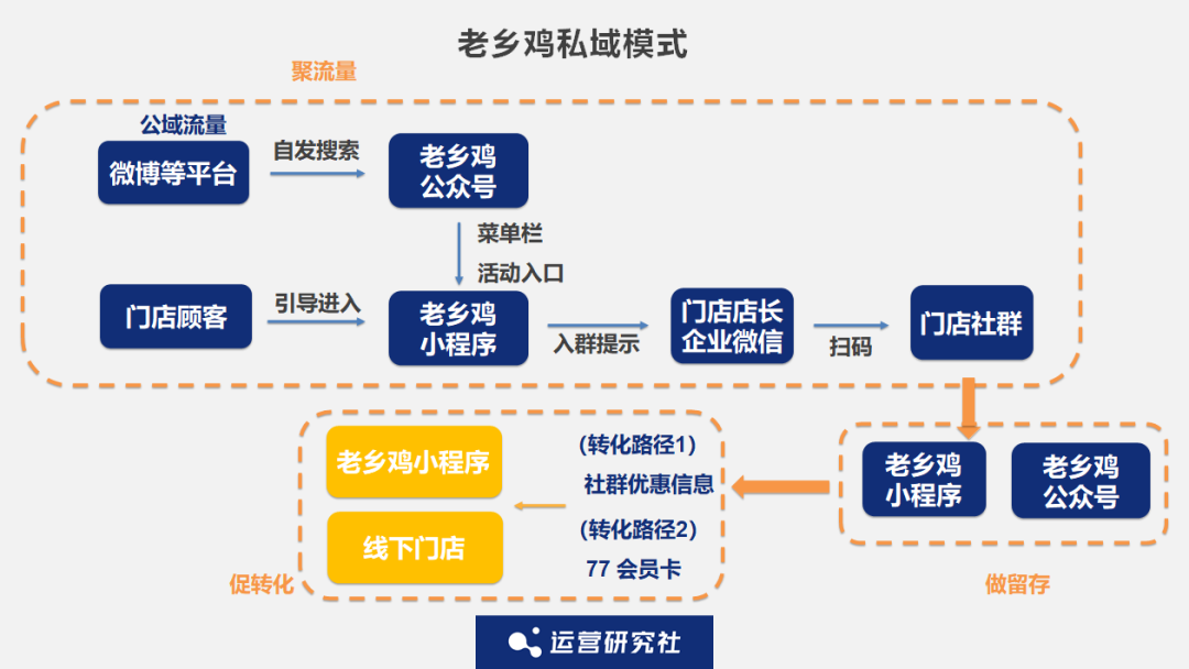 據(jù)@中商產(chǎn)業(yè)研究院 的數(shù)據(jù)顯示,2019 年時中式快餐占據(jù)快餐市場份額的 70.7% ,規(guī)模約 7557 億元。就在今天,據(jù)@投資界 報道,老鄉(xiāng)雞完成了 pre-ipo 融資,沖刺“中式快餐第一股”。在此之前,也有投資機構(gòu)對老鄉(xiāng)雞估值高達 200 億。老鄉(xiāng)雞能做到在中式快餐這一條“紅?!辟惖郎厦摲f而出,離不開其優(yōu)質(zhì)的菜品、成熟的管理系統(tǒng)等硬性條件。同時運營社發(fā)現(xiàn),老鄉(xiāng)雞的私域運營做得也很不錯。老鄉(xiāng)雞的私域模式,也可以用“私域 3 x 3 模型”來理解,共有聚流量、做留存、促轉(zhuǎn)化三個環(huán)節(jié)。然而在每一個環(huán)節(jié)中,老鄉(xiāng)雞會用一些“不常規(guī)”的運營方式來達成引流、留存、轉(zhuǎn)化的目的。運營社注意到,和很多餐飲店不同的是,老鄉(xiāng)雞在線下門店的餐桌上沒有貼碼,用戶不需要掃碼進入小程序也能直接點餐結(jié)賬。現(xiàn)在一部分餐飲店的引流策略帶有些「強制性」,譬如,用戶只能通過掃碼關(guān)注公眾號、進入小程序才能下單;甚至還有店家要求一定要掃碼進入社群才能下單。這樣的方式雖然確實可以起到引流作用,但卻容易引起用戶的反感,最終引來的也大都是“僵尸粉”——不會成為“回頭客”,甚至還會把店家取關(guān)拉黑。老鄉(xiāng)雞主要通過 2 種方式來積累自己的私域用戶:第一種,用“評價領(lǐng)券”將線下的顧客流量引導到線上。在線下門店,用戶不必通過掃碼才能點單,但是用微信支付結(jié)完餐費后,會彈出“評價領(lǐng)老鄉(xiāng)雞 3 元券”的提示,引導用戶進入小程序進行評價。這樣雖然不能百分百保證線下顧客會被引流至小程序,但是可以很大程度地降低用戶的反感。第二種,在公域平臺吸粉,讓用戶“自發(fā)搜索”老鄉(xiāng)雞。自 2020 年 2 月老鄉(xiāng)雞因為“老板手撕員工聯(lián)名信”和“ 200 元辦土味戰(zhàn)略發(fā)布會”火了之后,近一兩年來老鄉(xiāng)雞在公域平臺的動作也是接連不斷。