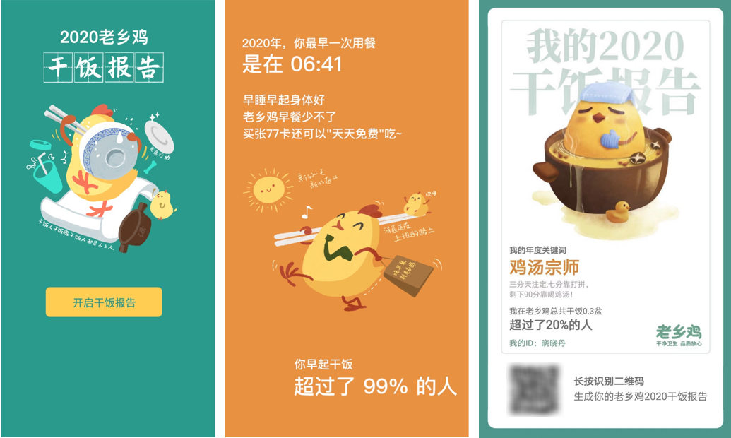 ?????????????????這個欄目直擊如今大眾對于“食品安全”的痛點,勇于暴露自身問題并及時改正的態(tài)度更是得到了許多用戶的認可和好評,有不少讀者稱“這就是我一直選擇老鄉(xiāng)雞的原因?!?/span>通過這樣的內(nèi)容,老鄉(xiāng)雞逐漸建立起用戶對品牌的信任。老鄉(xiāng)雞還會在小程序里上線一些好玩的小活動,讓用戶回訪小程序,并且引起用戶廣泛傳播,大幅提升小程序的曝光量。譬如,在 2020 年底時,老鄉(xiāng)雞在小程序里上線了一個“年度干飯報告”新功能——用戶可以查看自己一年以來在老鄉(xiāng)雞的“干飯成績”,還會得到一個“稱號”,例如“干飯王者”、“雞湯宗師”、“雞雜殺手”等等。用戶如果分享自己的“干飯報告”,還能拿到 3 張無門檻優(yōu)惠券。這樣的活動在中式餐飲品牌里還是比較少見的,知情人士表示,由于形式和內(nèi)容新穎有趣,還能拿優(yōu)惠券,當時引起了很多用戶自傳播。通過這樣的活動,老鄉(xiāng)雞不僅做好了用戶留存,還能擴大自己的品牌影響力。餐飲行業(yè)相比其他行業(yè)有一個明顯的特點,就是門店的盈利很大程度上依賴轉(zhuǎn)化率和復購率。一家餐飲店如果有大量“回頭客”,那生意一定能做得長盛不衰。虎拾文化創(chuàng)始人@孫平 曾針對“營業(yè)額=流量 * 轉(zhuǎn)化率 * 復購率 * 客單價”公式提出: