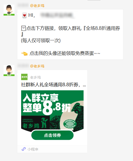 運營社注意到,老鄉(xiāng)雞社群存在一個現(xiàn)象,就是用戶們很少在群里進行討論。這對于餐飲業(yè)社群而言,其實是正常情況。畢竟餐飲社群和其他社群(例如美妝社群)不同,用戶沒有太多討論需求,只要能解決吃飯這個剛需就足夠了。大家買化妝品前會做很多功課,向客服詢問好不好用、適不適合自己;但吃一頓(人均 20 元、低客單價的)快餐前,就不會考慮這么多問題。很顯然,老鄉(xiāng)雞的社群就屬于以銷售為導向的社群,發(fā)言多不一定代表真正的“活躍”,用戶最終是否會去下單消費才是最重要的。用戶其實最在意的還是能否以更優(yōu)惠的價格吃到飯菜,因此社群里經(jīng)常會發(fā)放各種優(yōu)惠通知:每位用戶在進入一家門店的社群之后,店長會贈送“新人入群福利”:一張 8.8 折的優(yōu)惠券,以及一份免費蒸蛋,在下次點單時可以抵用。每到周三“社群福利日”時,社群福利管會發(fā)起“對暗號”活動:用戶輸入“暗號”,就可以得到一張滿減代金券。除此之外,每隔幾天,社群福利官還會發(fā)放“專屬福利”,譬如搶晚餐整單半價券、搶雞湯半價券等等。“雖然我們社群里討論不多,但是活動參與量非常的高。”知情人士向運營社透露,“靠著這些優(yōu)惠活動,轉(zhuǎn)化率提升了 20% - 30% ?!?/span>不過,老鄉(xiāng)雞也開始針對“社群里討論氛圍不濃厚”這一現(xiàn)象做出了一些改進,在社群里增加了“每周益答”環(huán)節(jié),來調(diào)動用戶的發(fā)言積極性。另外,知情人士也表示,由于每家門店都設(shè)有一個社群,老鄉(xiāng)雞還會針對不同的門店場景,在社群里做不同的運營動作。譬如,門店開在寫字樓里,平時周末就不會在它的社群里發(fā)消息,因為社群里的用戶多是上班族,周末時大家都不上班,用戶沒有消費需求,就算發(fā)得再多也沒有意義,反而會造成打擾;但如果門店是開在商場里,周末或節(jié)假日時則會在社群里多發(fā)一些優(yōu)惠信息,因為放假期間用戶多會選擇去商場逛街,此時可以吸引他們前去吃飯消費。對不同的社群針對性地做好運營策略,既可以不打擾到用戶,又可以充分發(fā)揮社群的價值。2) 靠 “ 77 會員卡”,復購率提升 1 倍多