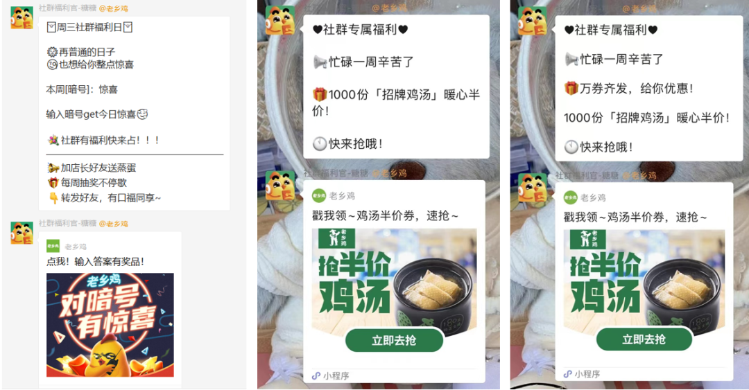 在完成私域環(huán)境搭建后,老鄉(xiāng)雞也是在慢慢摸索運營方式,不斷優(yōu)化自己的運營動作: