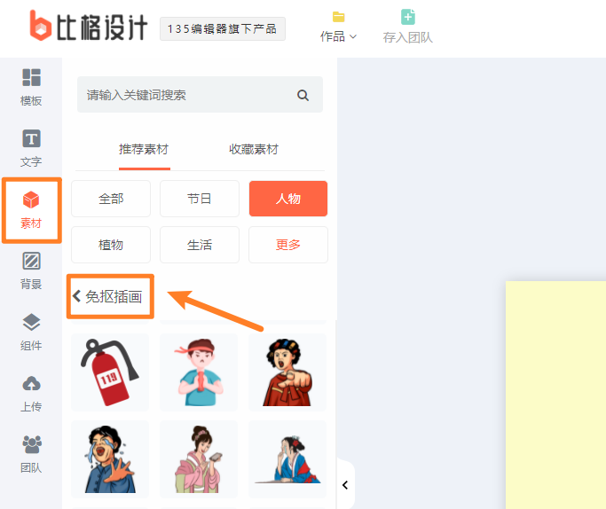 ● 進(jìn)入左側(cè)素材中心,選擇『免摳插畫』-『人物』,為封面圖添加一個有趣的漫畫表情包。