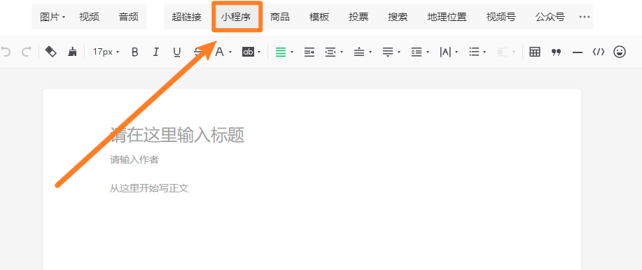打開微信公眾號平臺,新建一篇圖文消息,點擊上方的【小程序】按鈕;