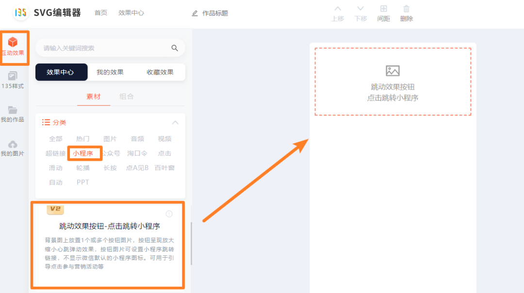 在『互動效果』欄目下的【小程序】里,點擊『跳動效果按鈕一點擊跳轉(zhuǎn)小程序』素材,將其添加到編輯區(qū)域。