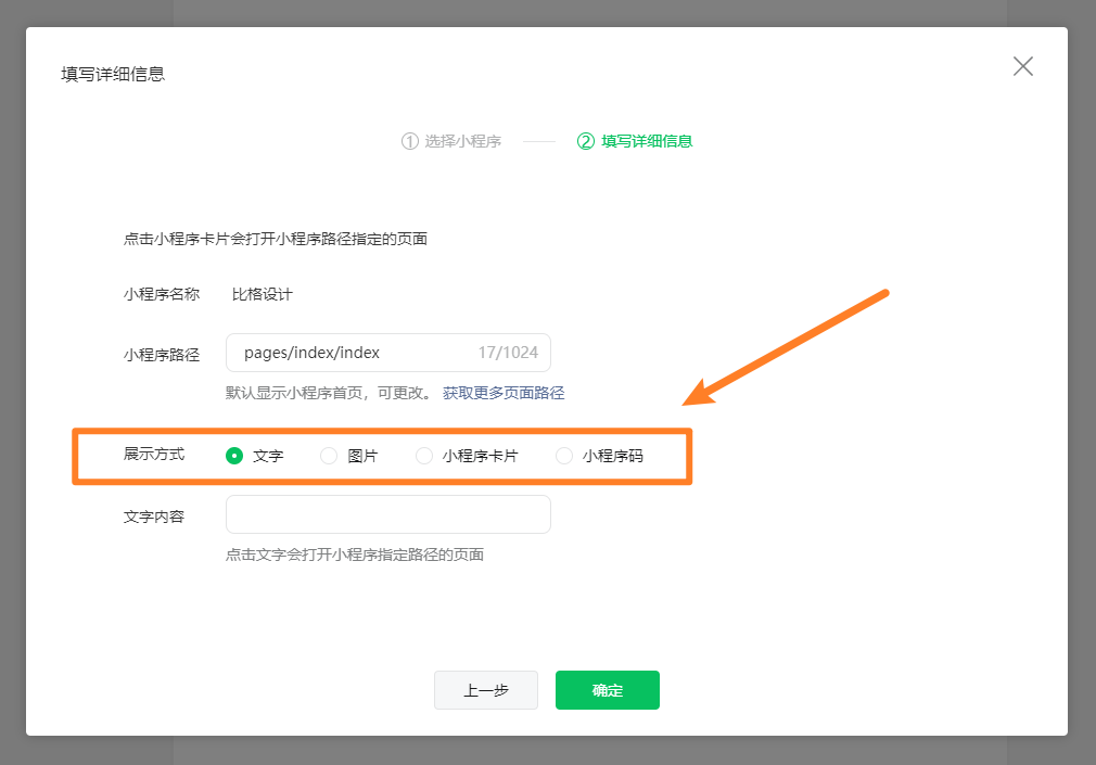 任意選擇一種小程序的展示方式,并配置好相應的文字或圖片,點擊確定;