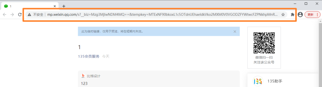 從圖文素材中點擊剛剛保存的文章的標題,進入文章的臨時預覽頁面,在網(wǎng)址欄中復制該文章的地址;