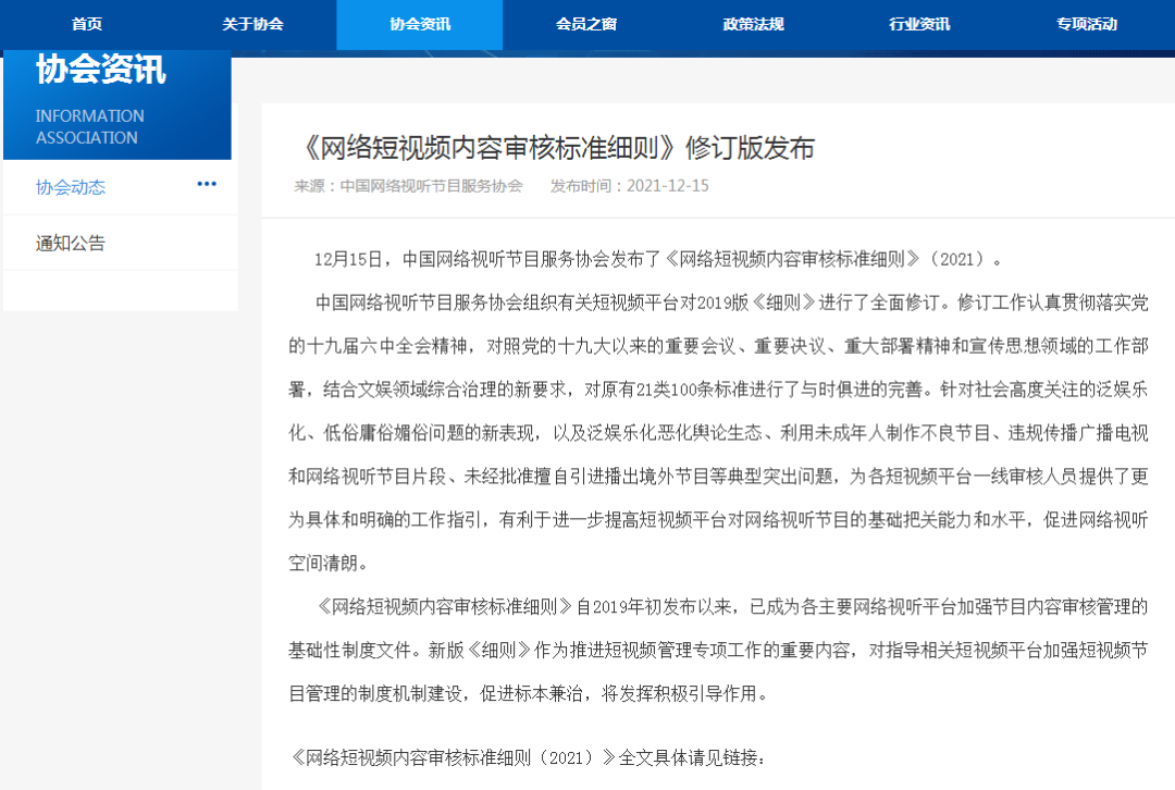 大概內(nèi)容是:協(xié)會(huì)組織有關(guān)短視頻平臺(tái)對(duì)2019版《細(xì)則》進(jìn)行了全面修訂,對(duì)原有21類(lèi)100條標(biāo)準(zhǔn)進(jìn)行了與時(shí)俱進(jìn)的完善。