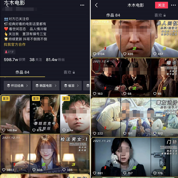 以抖音博主@木木電影為例:該博主剪輯的電影偏小眾,許多作品甚至連名字都沒(méi)有聽(tīng)過(guò),雖然有81.4萬(wàn)的粉絲,共發(fā)布了84個(gè)作品,但收獲的點(diǎn)贊僅有598.7萬(wàn),相對(duì)而言并不多。