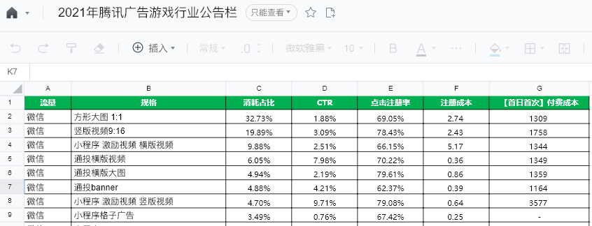 目前了解市場大盤信息可以通過“騰訊廣告游戲營銷顧問”提供的AMS游戲行業(yè)每周大盤數(shù)據(jù)更新,這里披露了微信小游戲各流量版位的具體數(shù)據(jù),如消耗占比、CTR、點擊注冊率、注冊成本,付費成本。這點個人覺得官方是做得特別贊的,對指導投放很有參考價值。