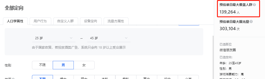 微信小游戲的定向和App的差不多,依然是優(yōu)量匯的定向特色——人群包為主,因此可以多挖掘一些高付費高價值人群包,作為初始定向。不同的是,微信小游戲的定向覆蓋數(shù)可以很低,只有10W+,照樣可以跑出去,而App類一般都得在幾百萬以上的覆蓋人群才能消耗出去。而目前朋友圈基本就是小游戲的天下,手游很難搶量,消耗占比越來越少。