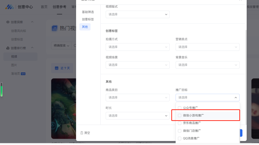 點擊“資產(chǎn)-我的素材-創(chuàng)意排行榜”,進入創(chuàng)意排行榜后,點擊“篩選”,在推廣目標處選擇“微信小游戲推廣”,即可看到有關(guān)微信小游戲的創(chuàng)意。
