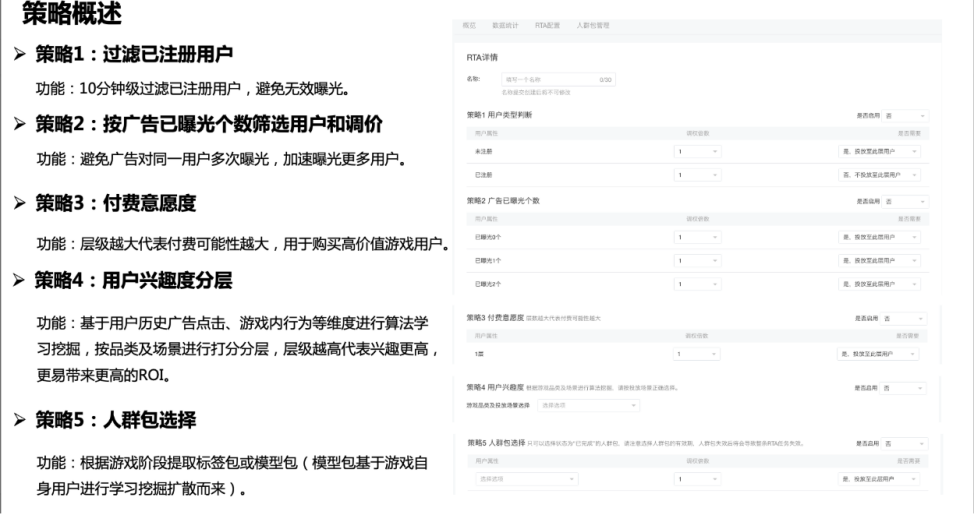有以下5種策略可以選擇,但對于中重度游戲以ROI為主要目標來說,測試重點:策略3-付費意愿度>策略2-曝光次數(shù)>策略1-過濾已注冊用戶>其他