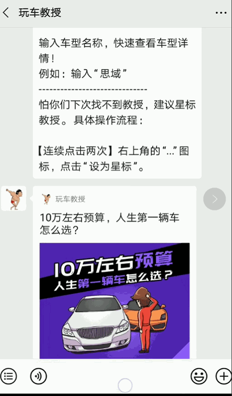 關(guān)注「玩車教授」的公眾號后,會出現(xiàn)下圖所示的兩條自動回復(fù)。