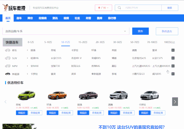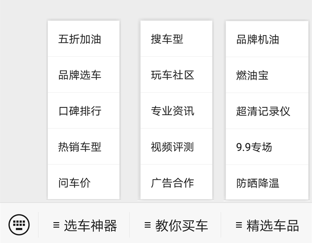 菜單欄中主要有三個大的選項:選車神器、教你買車、精選車品。選車神器和教你買車中的子菜單欄,除了廣告合作以外,都是跳轉(zhuǎn)到「玩車教授」的小程序。