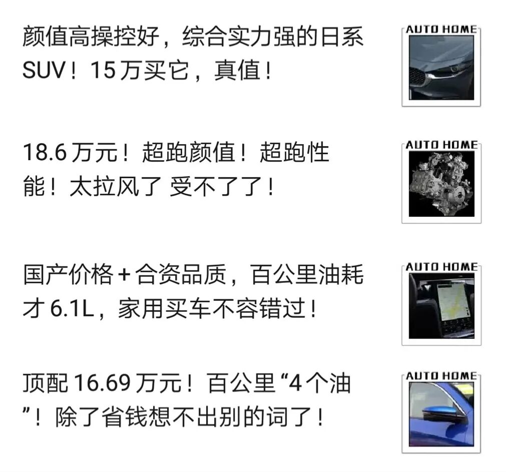 每條推送都是關(guān)于車的測評,不會在標(biāo)題中直接寫出車的品牌和型號。而是最簡短地概括出車的優(yōu)點,標(biāo)題中喜歡使用感嘆號,來增加強(qiáng)調(diào)的語氣。
