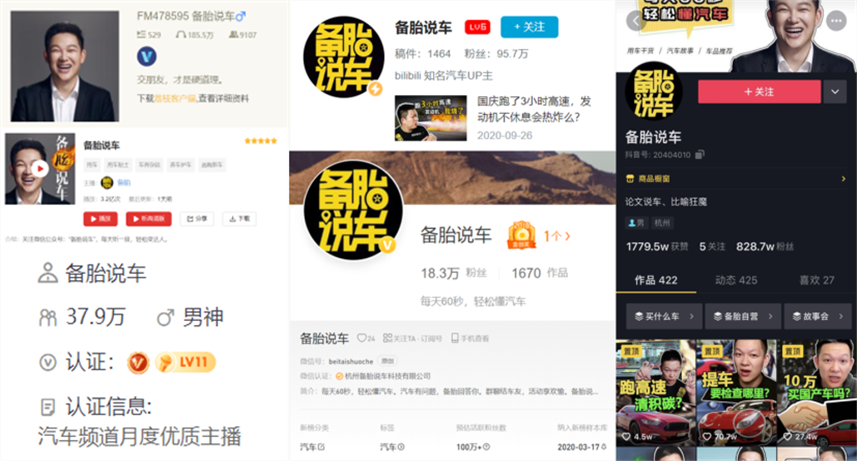 B站粉絲95.7萬,車家號粉絲18.3萬,抖音粉絲更是達(dá)到了828.7萬,算的上是能適應(yīng)多個平臺發(fā)展的現(xiàn)象級賬號。