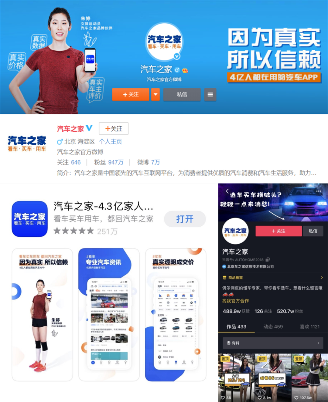 「汽車之家」的官方微博粉絲有947萬,抖音粉絲520.7萬,僅僅是App Store就有251萬的下載量,還請了女排運動員朱婷代言。公眾號數(shù)據(jù)就更是了不得了,預(yù)估活躍粉絲100萬+,頭條閱讀數(shù)10萬+。