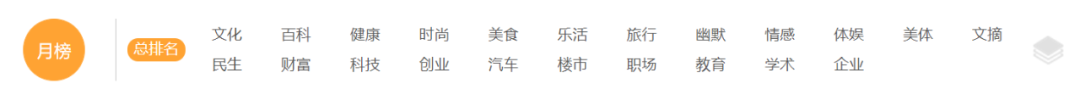 文化60個、百科15個、健康19個、時尚31個、美食4個、樂活29個、旅行2個、幽默3個、情感42個、體娛70個、美體5個、文摘0個、民生95個、財富37個、科技19個、創(chuàng)業(yè)3個、汽車11個、樓市0個、職場5個、教育43個、學(xué)術(shù)2個、企業(yè)5個。
