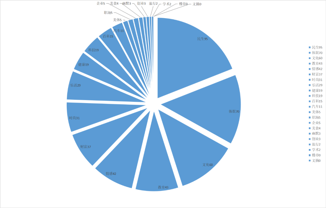 最多的三個分別是民生95個、體娛70個、文化60個,幾乎占據(jù)了半壁江山,文摘和樓市中并沒有上榜的公眾號。