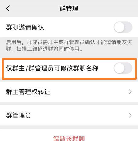 在微信群聊中進入“群管理”設(shè)置,我們可以看到新版本的微信加入了一個“僅群主/群管理員可修改群聊名稱”選項。