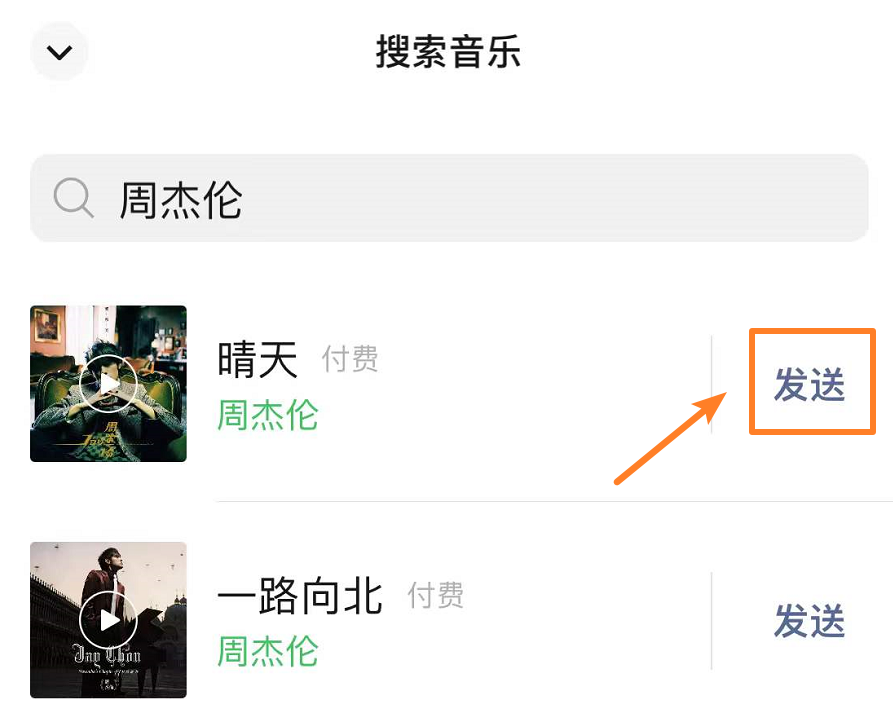 點擊可以搜索歌名、歌手以及歌詞,搜索結(jié)果中的歌曲可以直接通過聊天窗口發(fā)送給好友。