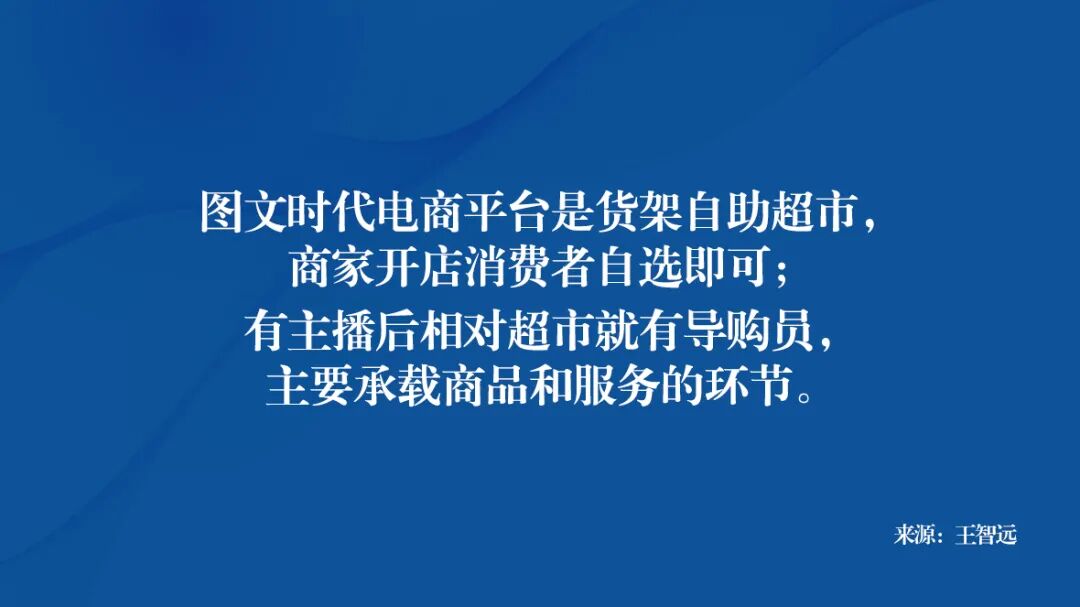 進(jìn)一步而言,在圖文時(shí)代電商平臺(tái)是貨架的自助超市,商家在上面開店消費(fèi)者自選即可;有網(wǎng)紅主播后相對超市就有“導(dǎo)購員”,他主要承載商品和服務(wù)的環(huán)節(jié)。