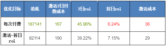 這是我通過ABtest,對(duì)比“每次付費(fèi)”和“激活-ROI出價(jià)”投放一周后的數(shù)據(jù)效果。