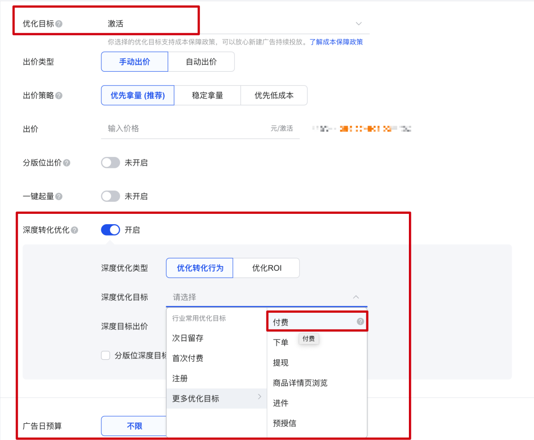 1、投放初期可以選擇單目標(biāo)【付費(fèi)】,出價(jià)策略【優(yōu)先拿量】,待跑量穩(wěn)定后,如果激活成本過高,可以換成雙目標(biāo)【激活-付費(fèi)】,來控制激活成本;