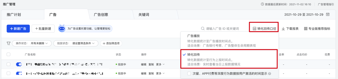 數(shù)據(jù)口徑:選擇【轉(zhuǎn)化回傳】口徑