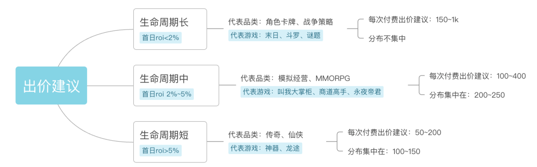 2、具體出價(jià)可根據(jù)產(chǎn)品近一個(gè)月實(shí)際【7日每次付費(fèi)成本】進(jìn)行梯度出價(jià)嘗試,或者根據(jù)游戲生命周期的不同階段進(jìn)行出價(jià):